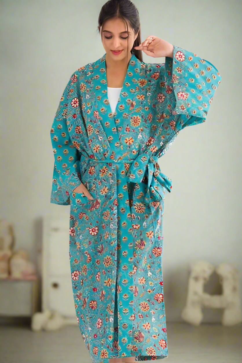 Our pretty Aquamarine Floral Robe is hand crafted from a soft 100% cotton block-printed fabric. Different hand carved wood blocks are used to hand stamp each color of the design using eco-friendly dyes. The seamless printing is indicative of the fine skill of the block-printers. Showcasing a vibrant rose, gold and turquoise print, and a contrast print on the sleeves, placket and belt, these beautiful cotton robes feature large pockets. One size fits most.