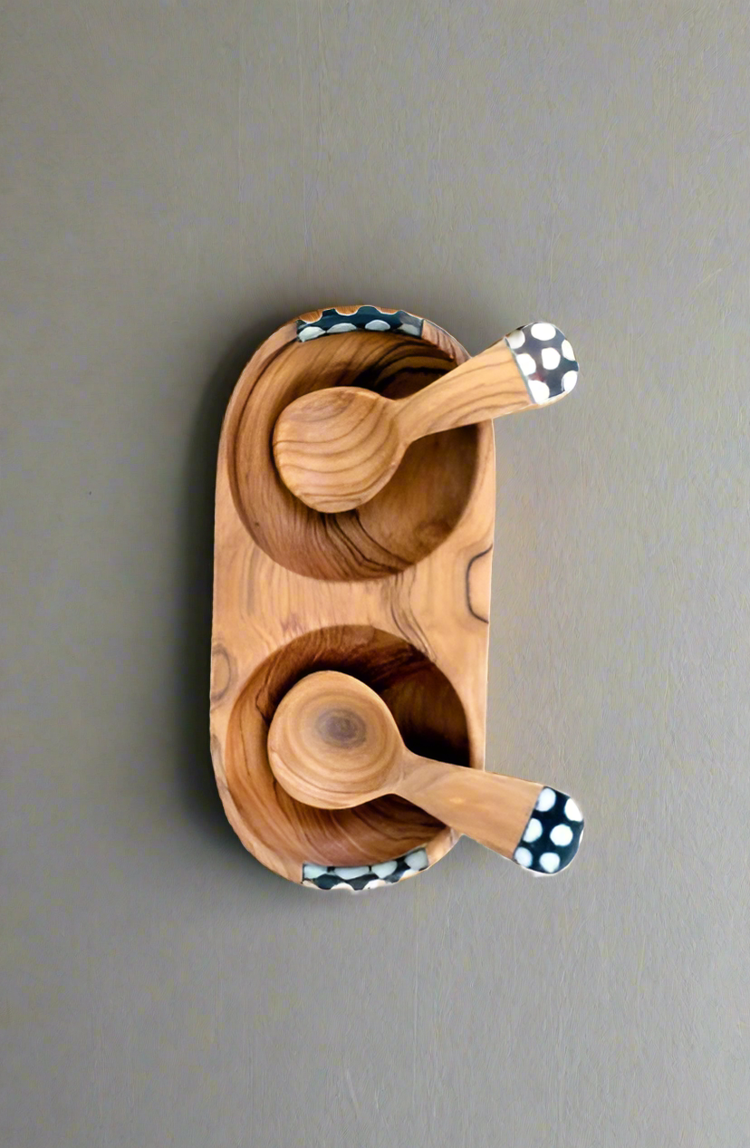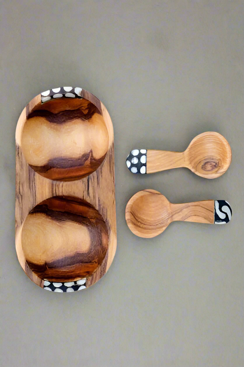 Handcrafted by Akamba carvers, this unique spice serving set is carved from wild olive wood and decorated with dyed cow bone inlay. The wild olive wood tree is prized for its richly grained wood. The wood is legally sourced from protected areas and the artisans take great care to utilize large and small pieces of the wood. The bone is waste bone which the artisans buy from a butcher local to their hometown.
