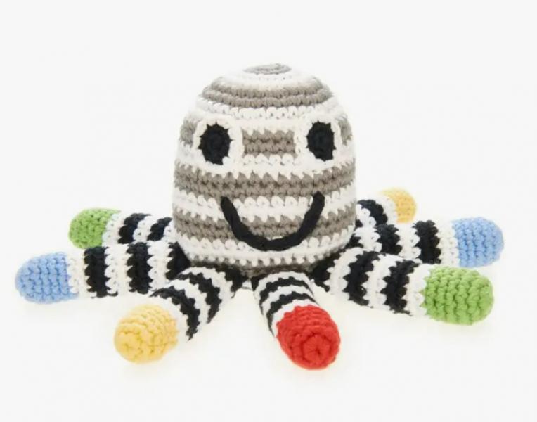 Our oh-so-cute Black and White Octopus is perfect for little hands. With its colorful arms and happy smile, this little sea creature is full of personality. When shaken, its soft rattle is sure to bring laughter and joy to your little one. Hand crocheted from soft cotton yarn in Bangladesh by women artisans working together in rural communities.- Handmade in Bangladesh