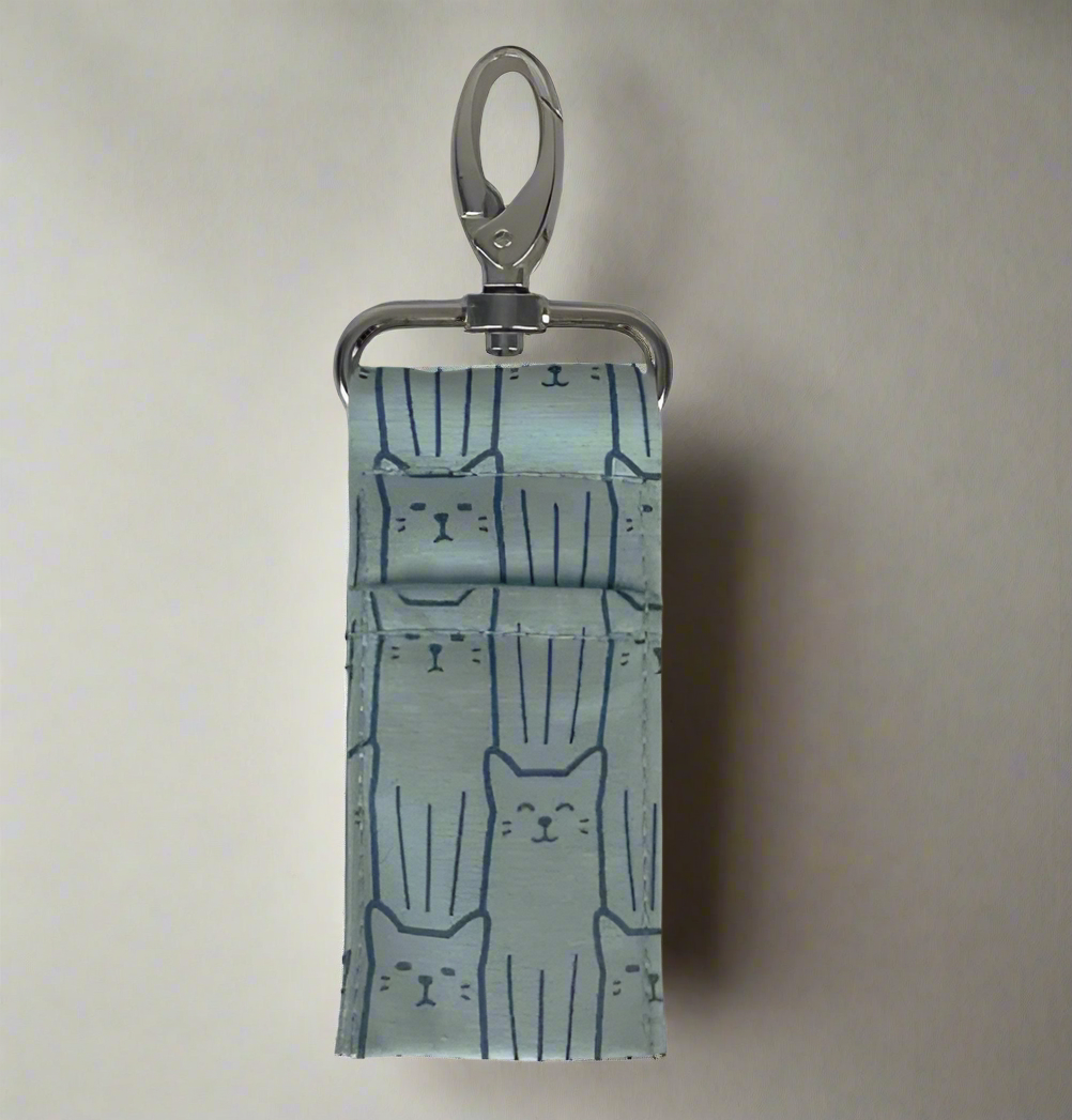 Never lose your lip balm again with our Blue Cat Lip Balm Bag. Handcrafted from screen printed cotton canvas fabric, this cute lip balm bag conveniently clips to you keys or your purse. Standard size lip balm tubes fit perfectly. Lip balm not included. A great gift!