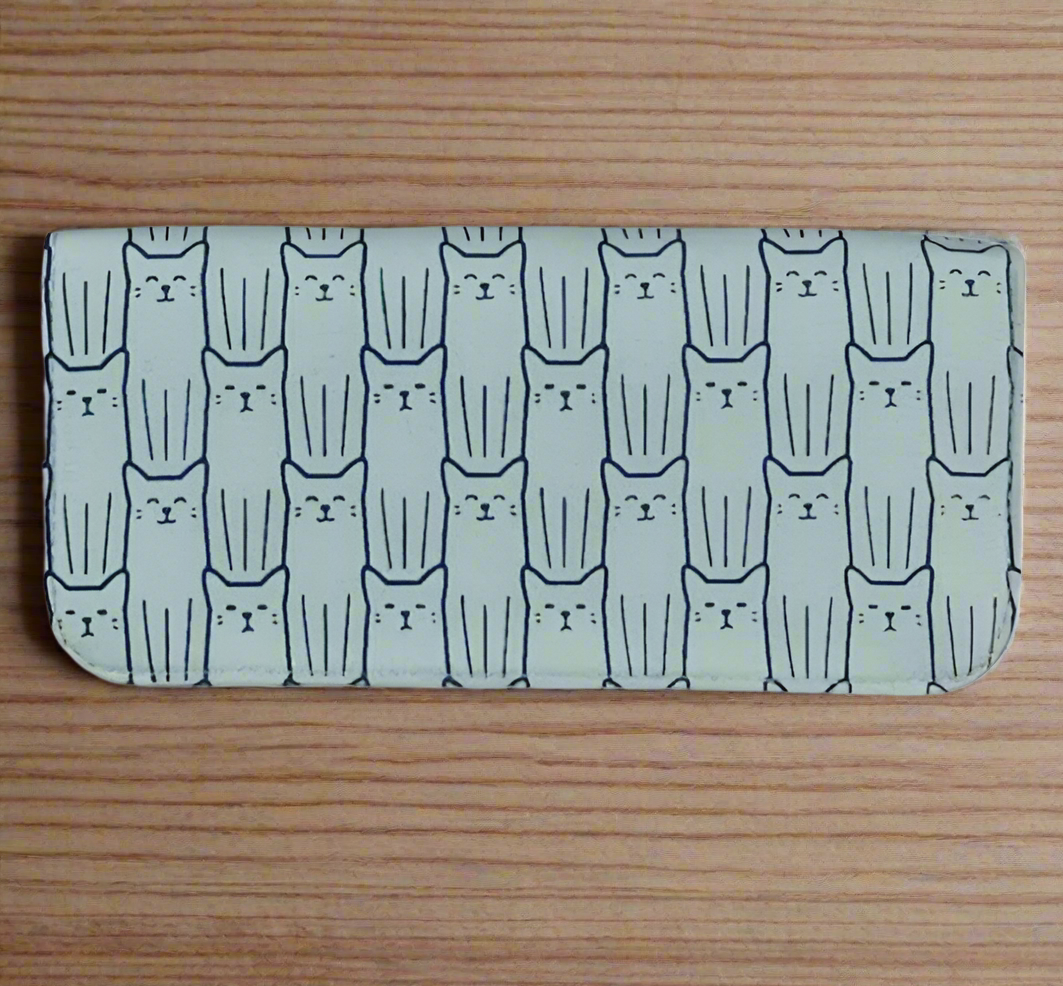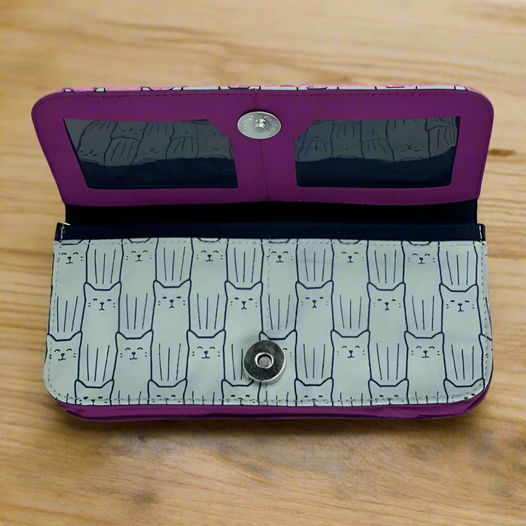 This unique, screen printed Blue Cat Print Wallet is fun and fashionable. Handcrafted from a screen printed blue cotton canvas and accented with a purple cotton canvas, it is lightweight, roomy and well organized. This customer favorite wallet design has a snap closure, two clear ID pockets, a dollar bill pocket, multiple credit card pockets and a change pocket.