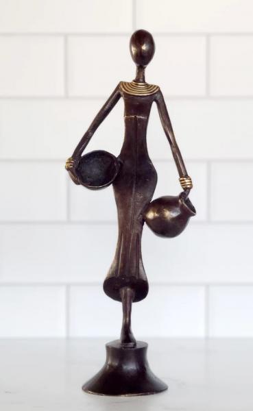 This elegant sculpture portrays a woman in a tailored gown and lustrous jewelry carrying a pot and calabash bowl. Handcrafted by talented artisans in west Africa using the lost wax method, each piece will vary slightly.