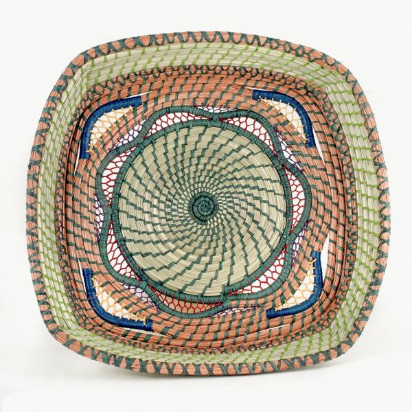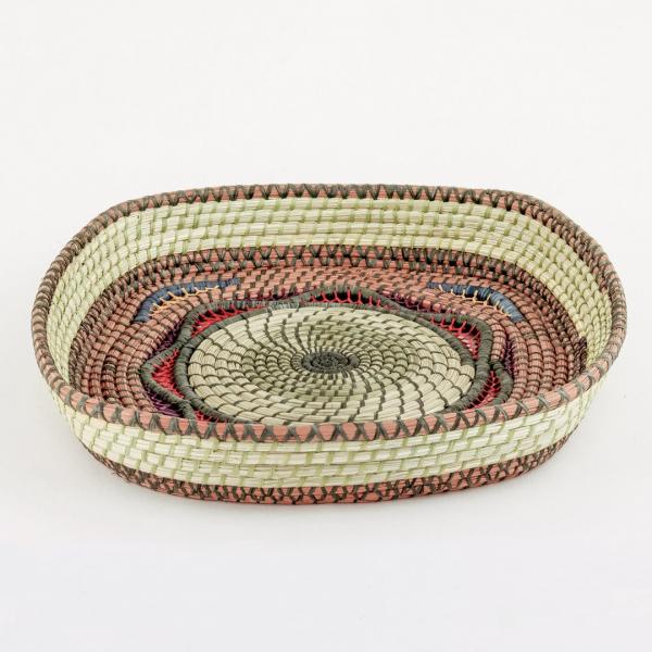 This beautiful basket is intricately handwoven from an indigenous grass and long needle pine needles with colorful raffia accents. Designed and handcrafted in a women's cooperative, this stunning basket is both practical and decorative.