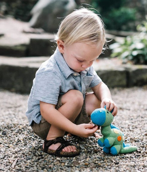Our collection of darling stegosaurus plush toys is always popular. This Green Dinosaur is the perfect toy for encouraging your child's imagination to wander back to prehistoric times. Handcrafted by women artisans using soft organic cotton yarn and featuring delicate stitched details, this timeless stuffed stegosaurus will make a delightful gift for a baby shower or baby's first birthday. This plush toy is durable and washable, and the rattle inside gives a very soft sound when shaken. Designed to last, this toy will be treasured by toddlers and older children as well.