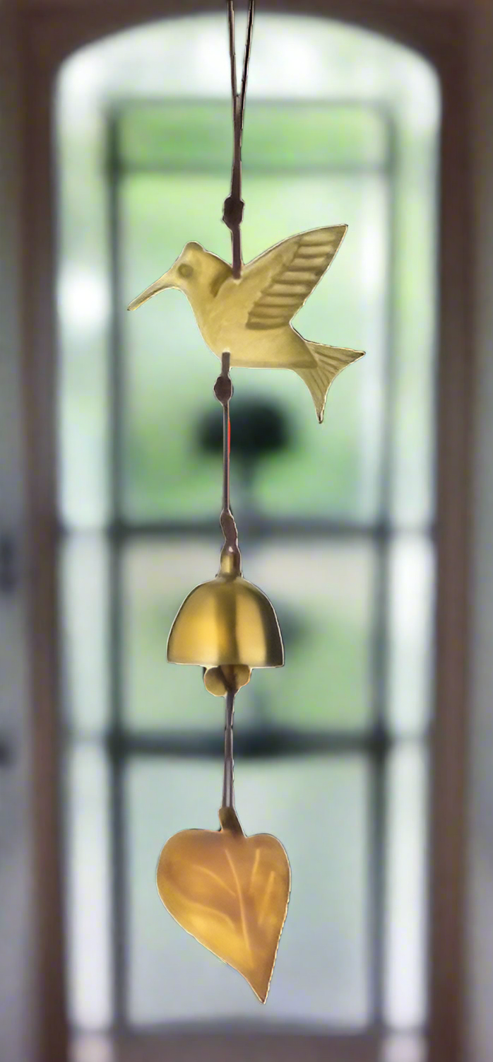 Our detailed Hummingbird Chime will make a wonderful accent to your porch area. Handcrafted from solid brass by Tibetan and Indian artisans, each bell and element of the chime is individually sand-cast and meticulously hand-tuned to ensure clarity of sound and tone. Strung on a durable waxed cotton cord.