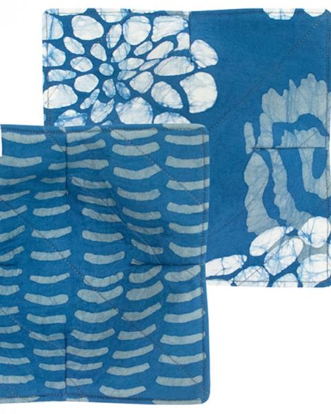 A customer favorite for "best kitchen accessory"! Our stylish Indigo Flowers Bowl Cozy is cute and practical. Features a design of flowers on outside and a dashes pattern on inside in shades of blue and white. Handcrafted from hand batiked organic cotton, with an interior layer of foam, this bowl cozy keeps your hands safe while holding hot bowls as you eat. Place a bowl in the bowl cozy, add food to be cooked or heated to bowl and place the bowl cozy with bowl into your microwave. Heat or cook, and remove safely by sliding bowl cozy onto your hand. So much more convenient than using pot holders. Enjoy your meal in comfort. For ice cream lovers, an added bonus - use the bowl cozy for your bowl of ice cream during colder times of the year.