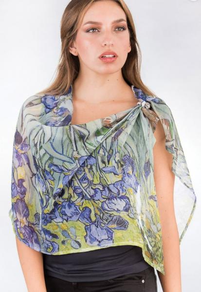 This pretty lightweight Iris Scarf is reminiscent of Van Gogh's Irises. Woven from 100% cupro, a luxurious, sustainable fabric made from repurposed cotton waste in a closed loop system. The georgette finish of this scarf has the look and feel of silk, but it is lightweight and breathable like cotton. This ultra-soft scarf features a beautiful iris print and is the perfect accessory - wear it tied across your shoulders, to accent a plain T, or tied to your purse.