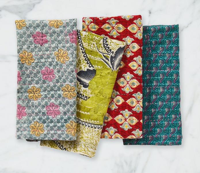 These attractive soft napkins are made from a double layer of recycled cotton sari fabric and then finished with traditional kantha embroidery. The sari fabrics come in an array of traditional Indian patterns and colors, and each finished napkin is unique in color and pattern. Set of 4.