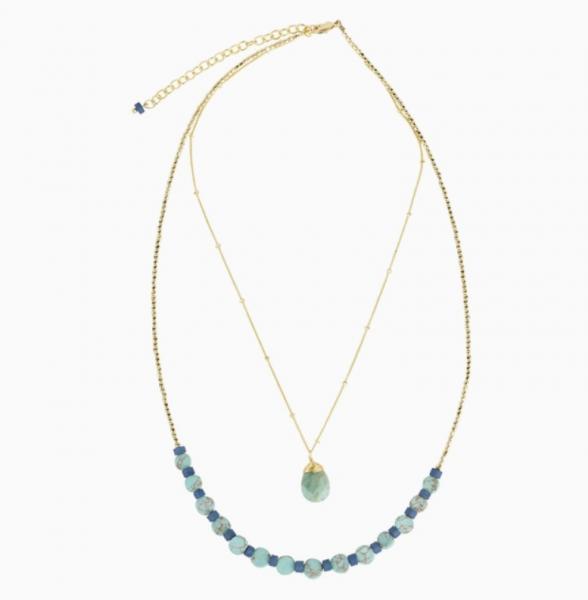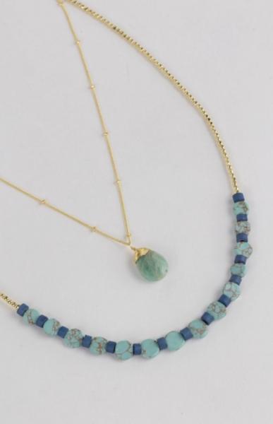 In calming ocean colors, our pretty Layered Amazonite Necklace is perfect for sunny summer days. Handcrafted, this two layer necklace features an amazonite pendant on a brass chain and a brass beaded chain holding glass and clay beads. Amazonite is called the hope stone, known to calm fears and open hearts.