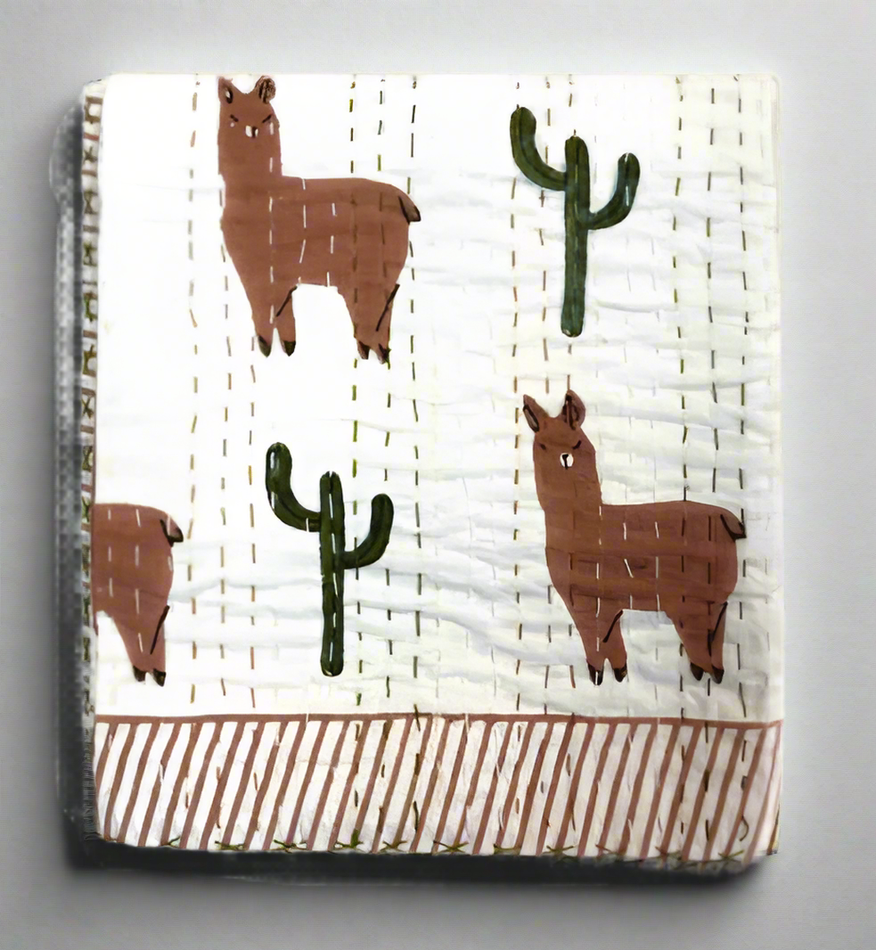 This beautiful hand crafted children's cotton quilt features an adorable hand block printed llama and cactus design. Crafted with love and designed for comfort, this blanket will be a delightfully cozy companion for your little one. A traditional art form in India, block printing involves hand stamping lengths of fabric with color using hand-carved wood blocks. Different blocks are used to produce the different colors for each design. The reverse side of the quilt is a solid white cotton. The artisans use a traditional Kantha stitch to hand sew the front and back pieces of the quilt together. These baby quilts are also perfect as floor play blankets, a picnic blanket or a beach throw.
