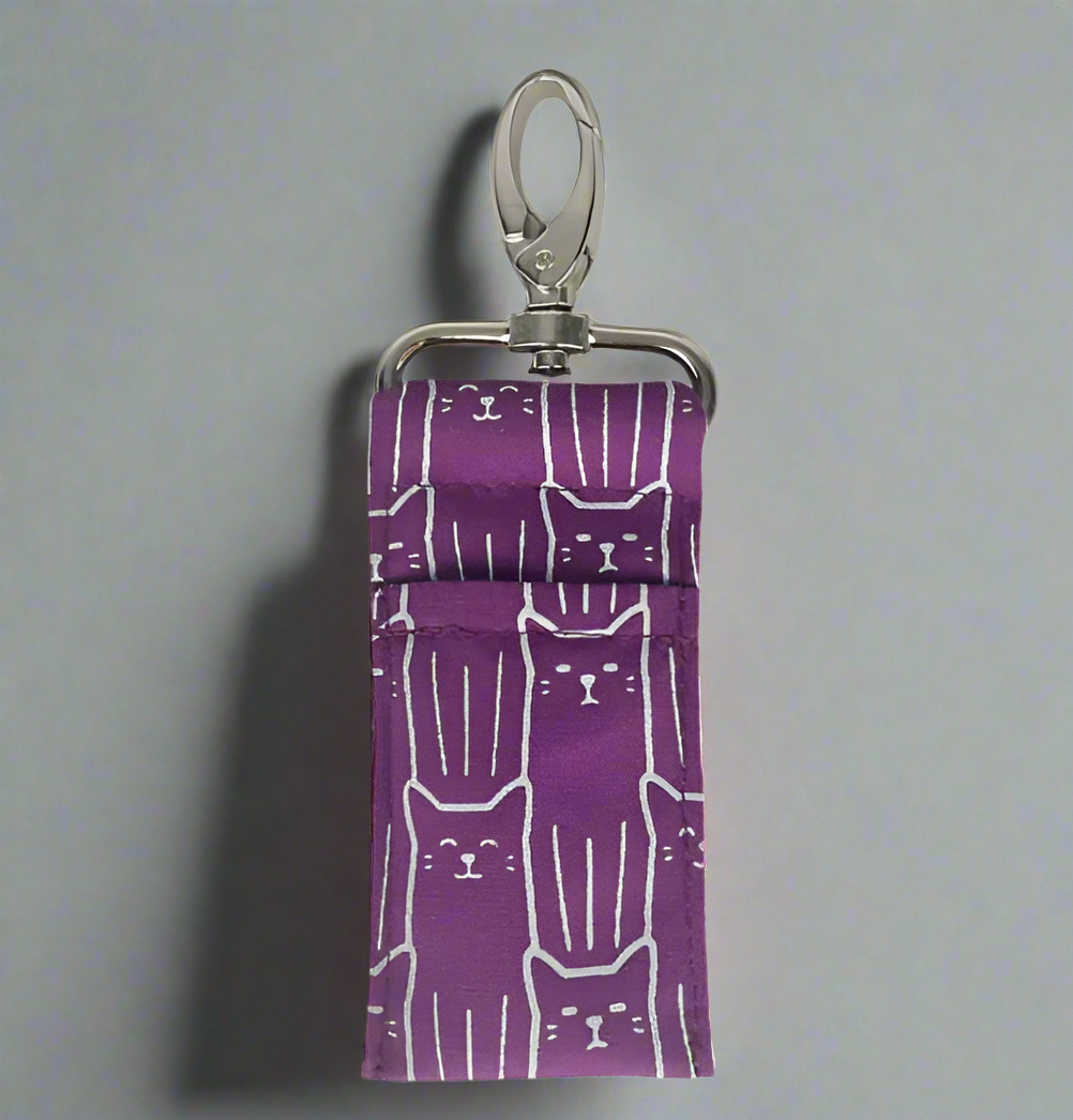 Never lose your lip balm again with our Purple Cat Lip Balm Bag. Handcrafted from screen printed cotton canvas fabric, this cute lip balm bag conveniently clips to you keys or your purse. Standard size lip balm tubes fit perfectly. Lip balm not included. A great gift!