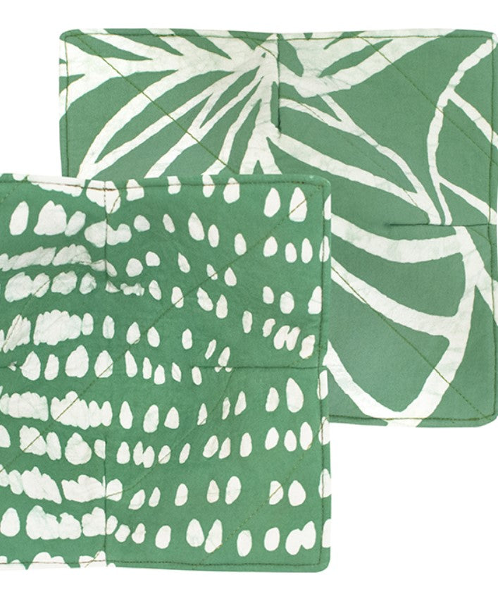 A customer favorite for "best kitchen accessory"! Our stylish Sage Leaves Bowl Cozy is cute and practical. Features a large leaf pattern on outside and raindrop pattern on inside. Handcrafted from hand batiked organic cotton, with an interior layer of foam, this bowl cozy keeps your hands safe while holding hot bowls as you eat. Place a bowl in the bowl cozy, add food to be cooked or heated to bowl and place the bowl cozy with bowl into your microwave. Heat or cook, and remove safely by sliding bowl cozy onto your hand. So much more convenient than using pot holders. Enjoy your meal in comfort. For ice cream lovers, an added bonus - use the bowl cozy for your bowl of ice cream during colder times of the year.