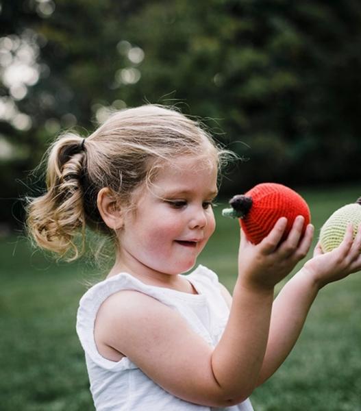 Our plush Smiling Apple is perfect for your little one's first kitchen. Hand crafted by women artisans, these cheery red toys are designed for little hands and the rattle inside makes a soft jingle when shaken. A must have for pretend play.