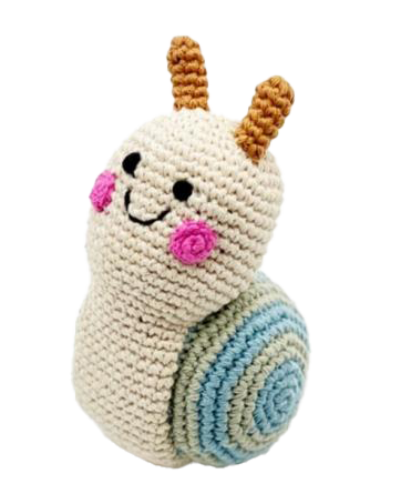 Our sweet Smiling Snail is sure to appeal to your little one. Handcrafted by women artisans, these smiley faced plush snails are quirky and lovable. The soft rattle sound is sure to have your child reaching out for more play time.