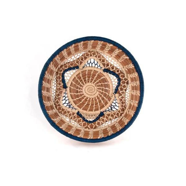 This attractive basket with a star design is both functional and a great display piece. Artisans carefully stitch raffia in both natural and blue shades around pine needles to create a six-pointed star motif.