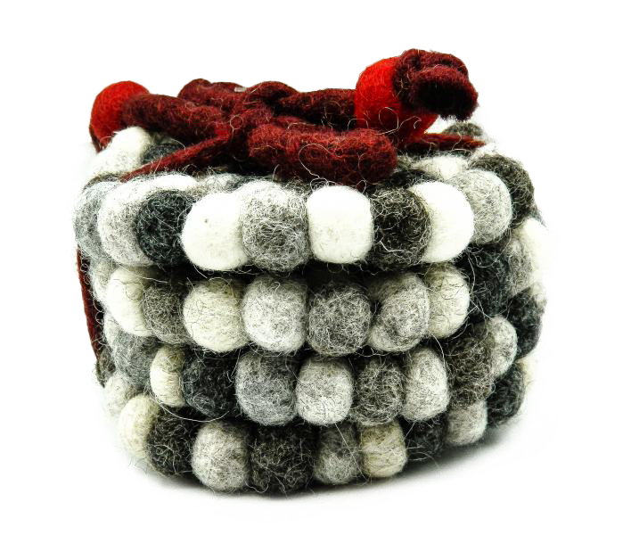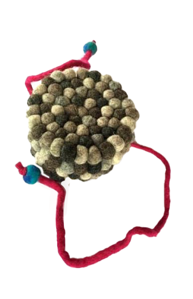 Our Stone Felt Ball Coasters will brighten up any table. Hand crafted by women artisans using 100% wool felt balls colored with azo free dyes, which are hand-sewn together. These coasters are reversible and the set of four comes with a tie for easy storing. Great to use along with our Stone Felt Ball Trivets.