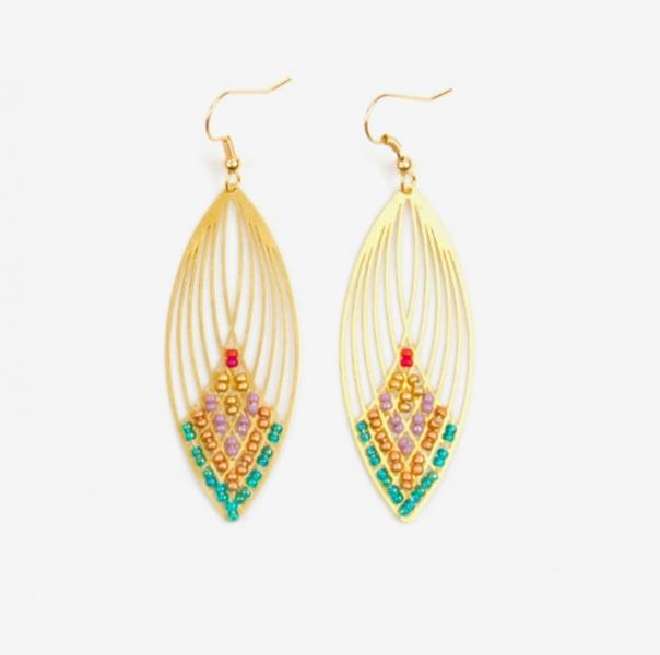 Our Teal Swooping Oval Earrings are the perfect design for a sophisticated look. Handcrafted by Mayan women, these stunning earrings will add both glitz and color to your look. The graphic yet delicate curves of brass are accented with red, gold, purple, bronze and turquoise glass beads.