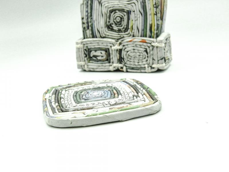 Handcrafted in a women's cooperative, our Upcycled Paper Coasters will add a unique touch to your entertaining. The artisans upcycle old newspapers into new products by wrapping the paper into coils which are formed into spiraled square building blocks. The blocks are held in place with thread and/or glue and then starched. These coasters will withstand heat and moisture that comes with average use. Due to the varying print colors of the newspapers, the coaster colors will vary. Sold as a set of four coasters in a recycled paper holder.
